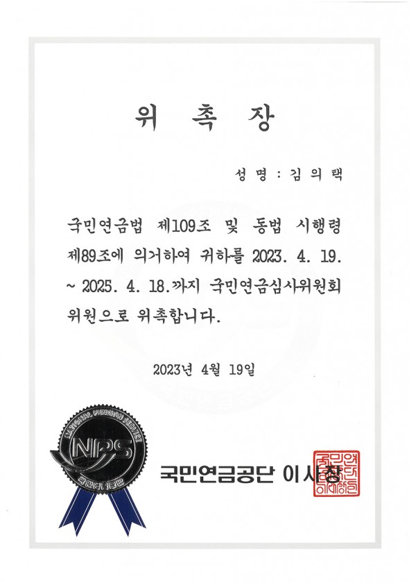 국민연금심사위원회위원 위촉-김의택