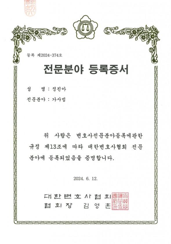 대한변호사협회 전문분야 등록증서 가사법-정진아