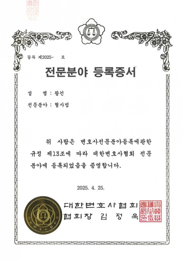 대한변호사협회 전문분야 등록증서 형사법-왕건