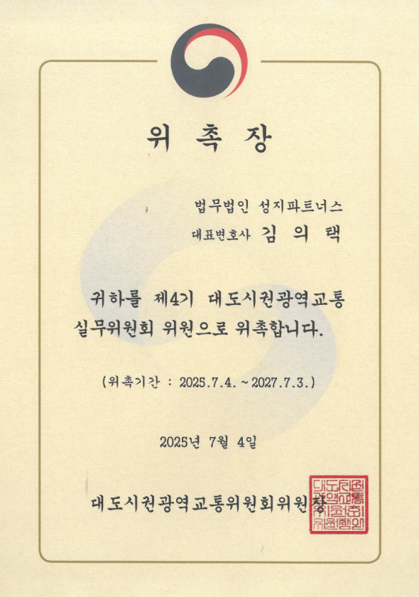 대도시권광역교통 실무위원회 위촉장_김의택