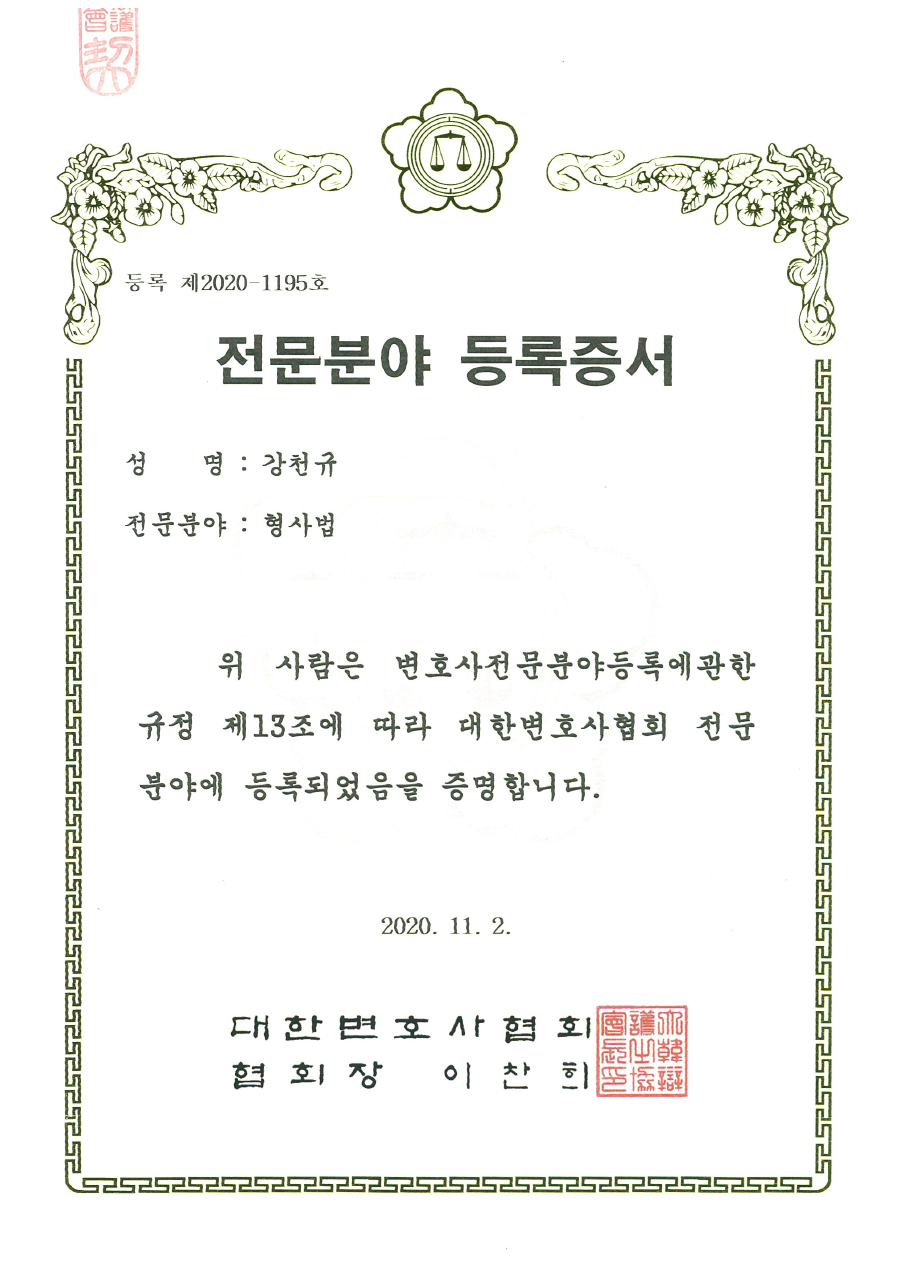 대한변호사협회 전문분야 등록증서 형사법-강천규